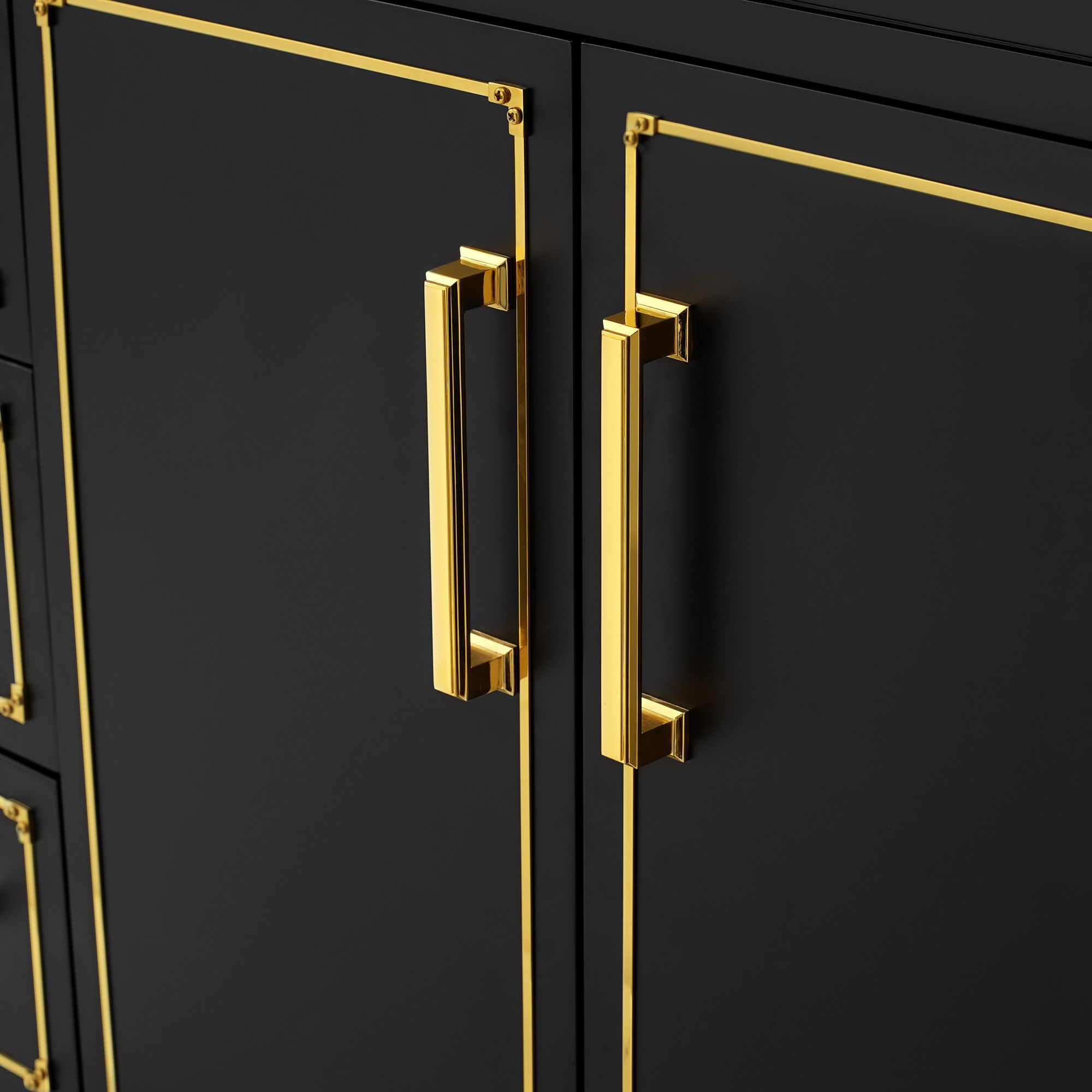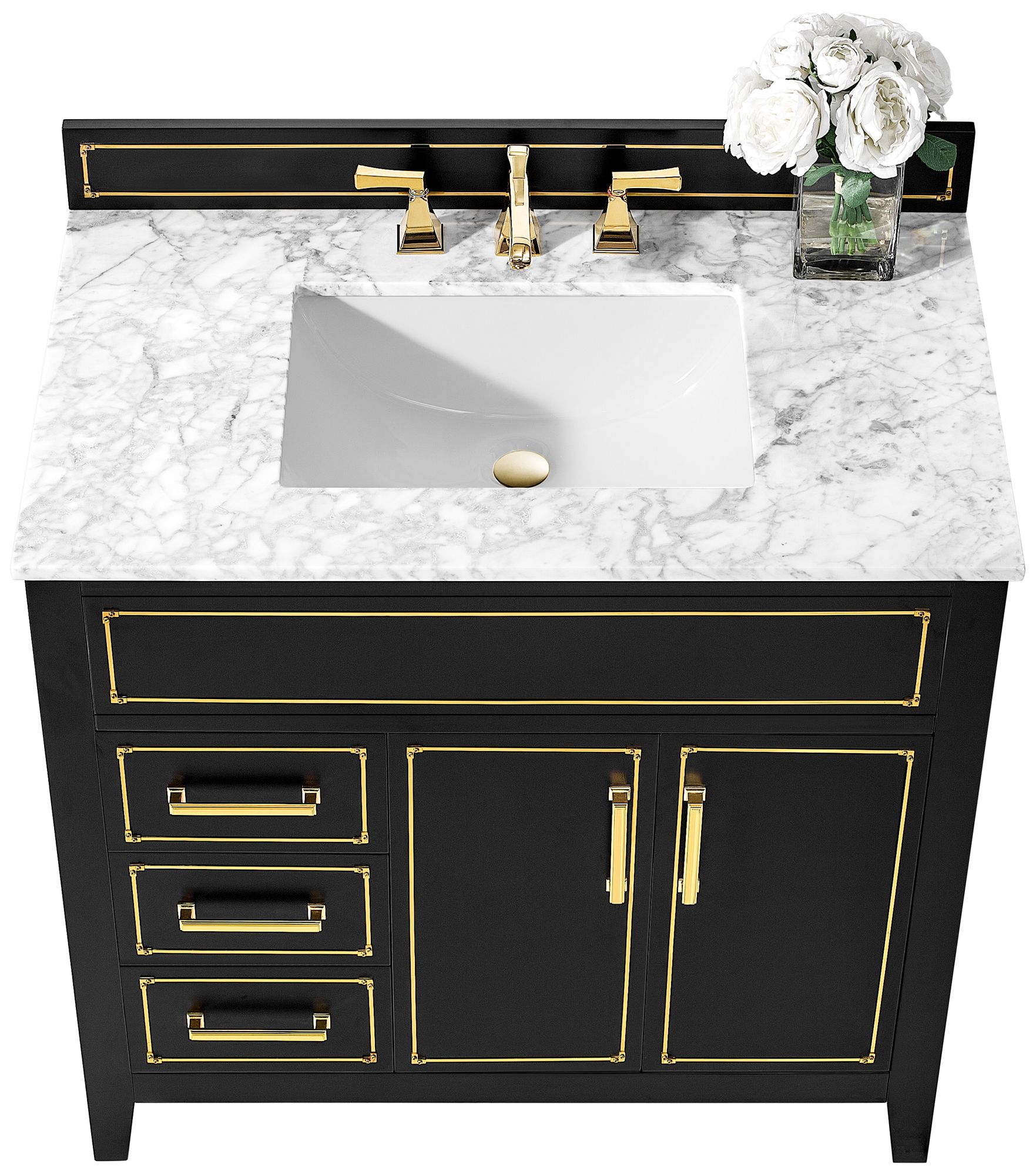 The vanity is hand carved and stained and comes with a finish choice of black, dark cherry, or white.